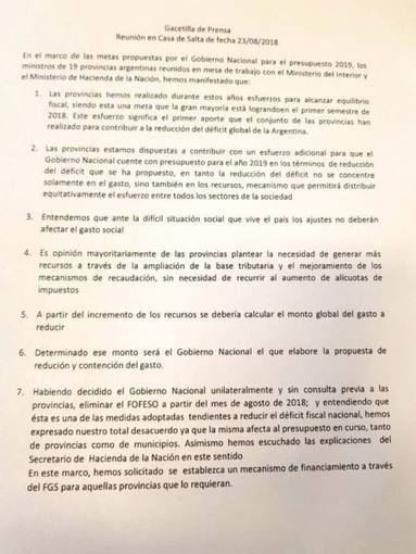 Ministros de las 19 provincias que no son gobernadas por la coalición radical-Pro de Cambiemos (excepto San Luis), se reunieron en la Casa de la Provincia de Salta para avanzar en un acuerdo con el Ejecutivo, que compense la eliminación unilateral por decreto del Fondo Federal Solidario, el «Fondo Sojero», de cara al debate por el Presupuesto 2019. ¿Que propusieron las provincias?: que el oficialismo meta mano al Fondo de Garantía de Sustentabilidad de ANSES, los fondos que garantizan las actuales y futuras jubilaciones de los argentinos. Leé el documento acá.