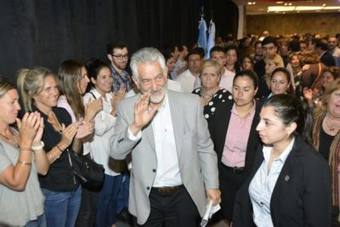 “En el caso de los trabajadores dependientes de la administración pública provincial, hablo de todos los sectores, es decir, docentes, salud, seguridad. Todos. Siendo que llevamos otorgado un incremento salarial del 21 por ciento del mes de marzo, y que posteriormente anunciamos un bono extraordinario a pagar en cinco cuotas. Mil en octubre, dos mil en noviembre, dos mil en diciembre, dos mil en enero y dos mil en febrero, lo que totalizaba un bono de $9.000, entendemos necesaria una recomposición salarial más superadora. Queremos superar ese bono. Es decir que, para preservar el poder adquisitivo, vamos a accionar la cláusula gatillo”, expresó y una ovación de pie por parte del público le impidió continuar.