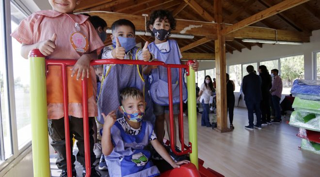 La jornada se llevó adelante en el establecimiento educativo ubicado en el cruce de las calles Adolfo Romero y Bartolino Escobar, donde se hizo una entrega simbólica a los directivos de los jardines, quienes recibieron un moderno mangrullo para la zona del patio y un panel de tatetí.