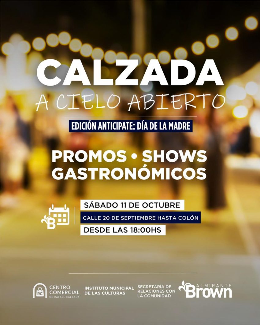 En tanto, Calzada a Cielo Abierto se realizará este sábado sobre la calle 20 de Septiembre hasta Colón, desde las 18 horas, con una consigna especial: anticiparse al Día de la Madre y encontrar en una gran variedad de stands el regalo ideal. Durante la jornada se presentarán 1630, JPA Reggae Ska, Walter Mazzioti, Soledad Ibarra y Tuty Cuarteto.