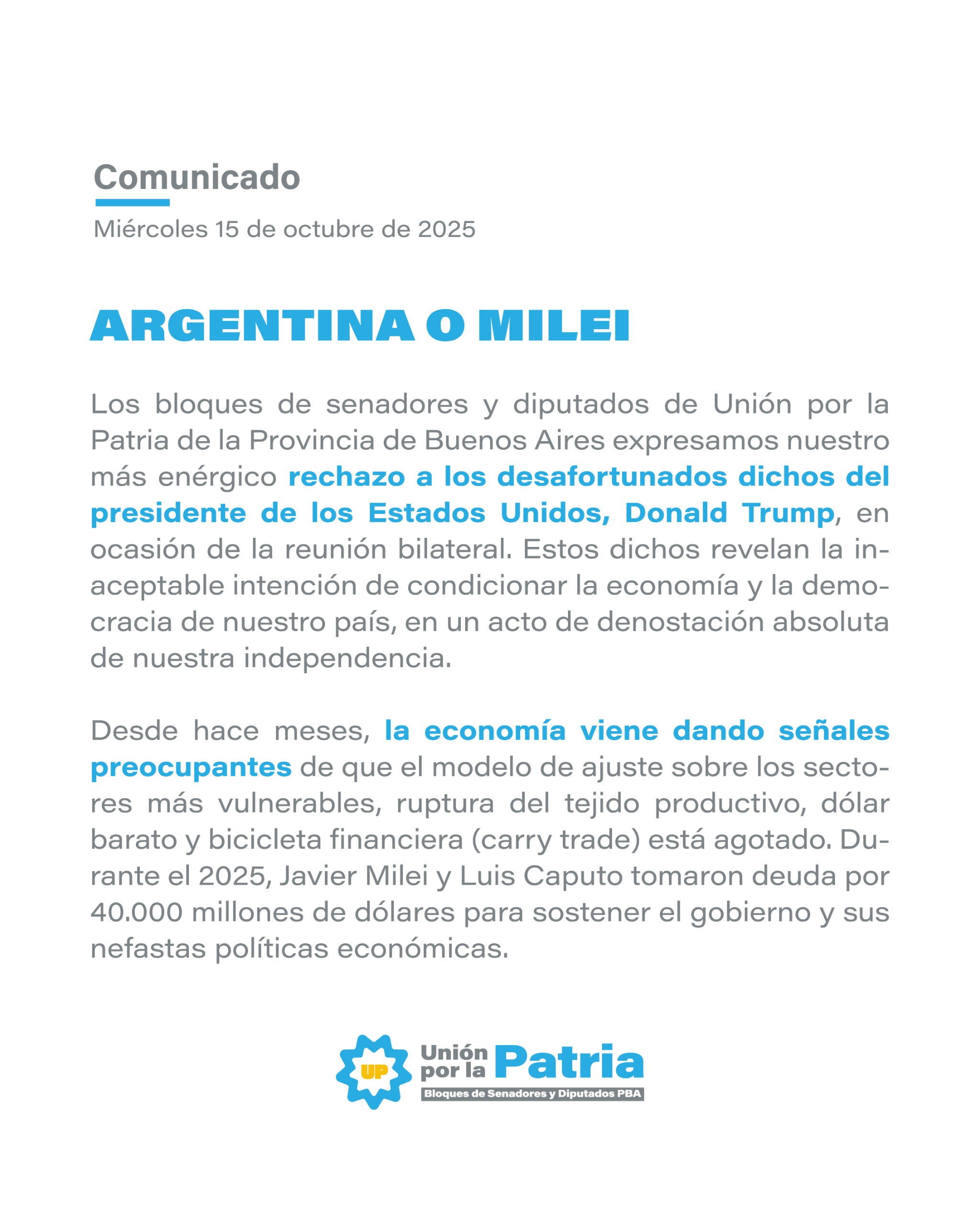 Los bloques de senadores y diputados bonaerenses de Unión por la Patria emitieron un comunicado en el que expresaron su “más enérgico rechazo” a los dichos del presidente de Estados Unidos, Donald Trump, tras su reunión bilateral con Javier Milei. Según los legisladores, sus declaraciones “revelan la intención de condicionar la economía y la democracia argentinas” en beneficio de intereses extranjeros.