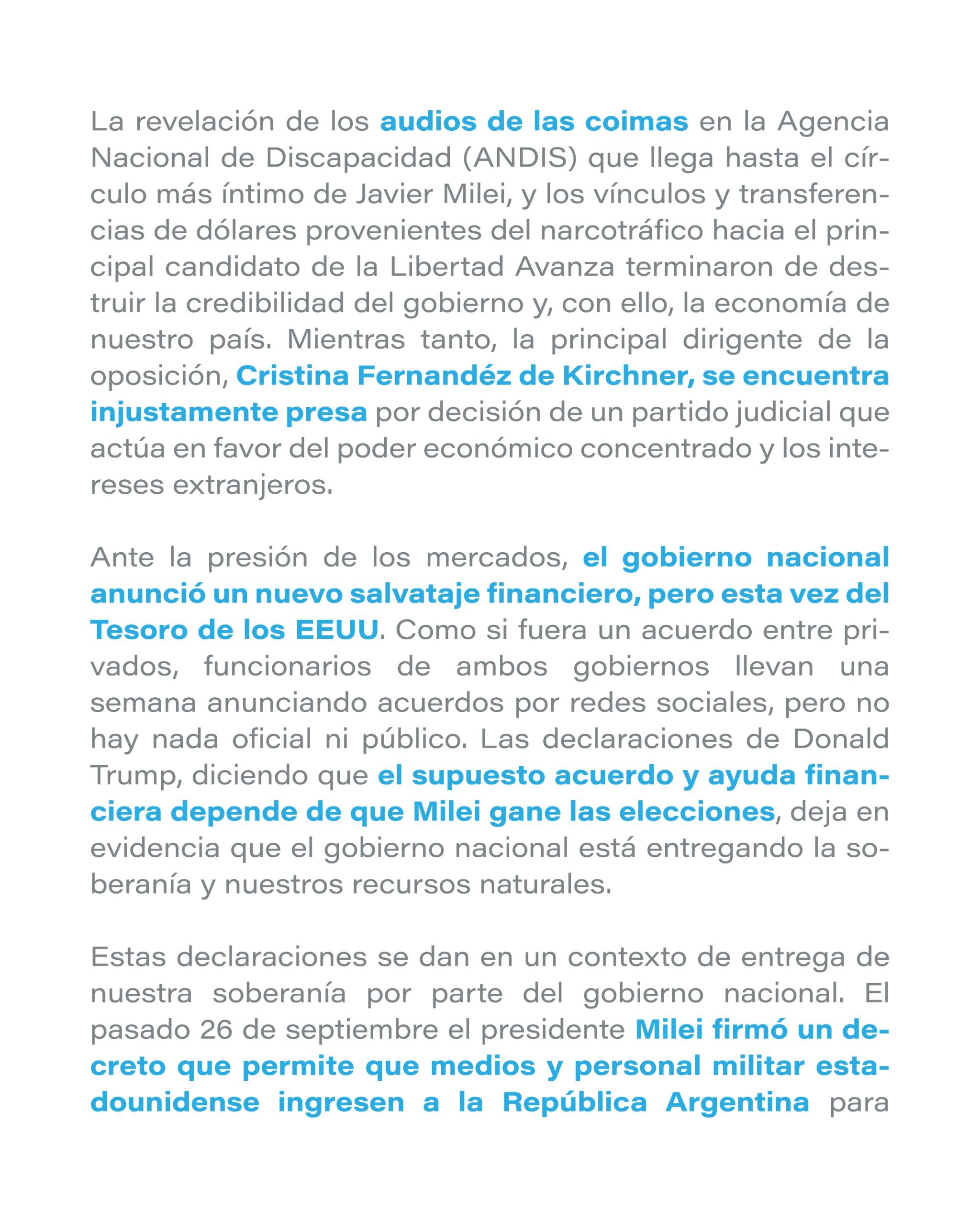 El documento también menciona los audios de coimas en la Agencia Nacional de Discapacidad (ANDIS) y los presuntos vínculos financieros con el narcotráfico que alcanzan al entorno más cercano del presidente. Para los legisladores, estos hechos “terminaron de destruir la credibilidad del gobierno y la economía del país”.