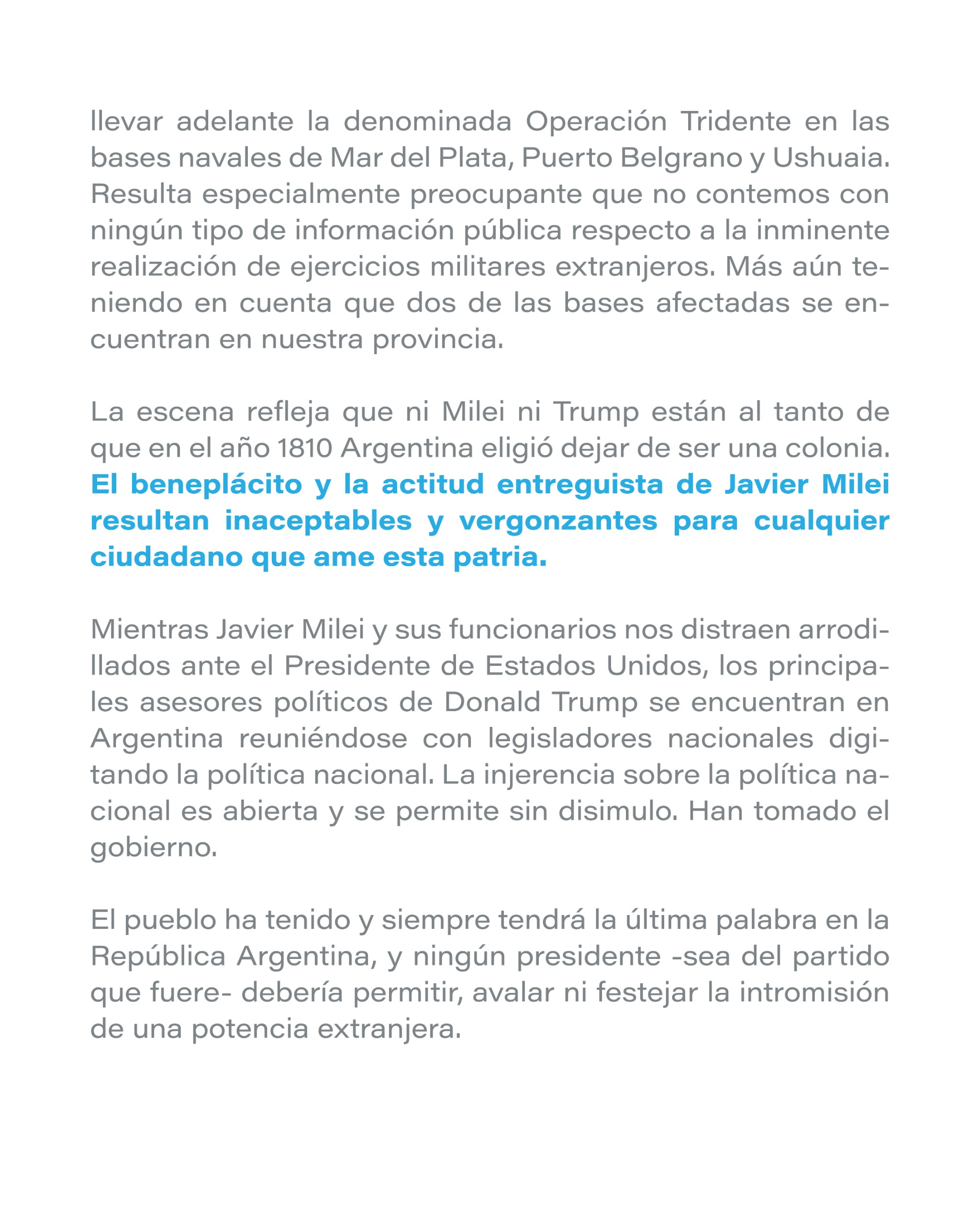 “El beneplácito y la actitud entreguista de Javier Milei resultan inaceptables y vergonzantes para cualquier ciudadano que ame esta patria”, sostuvieron.