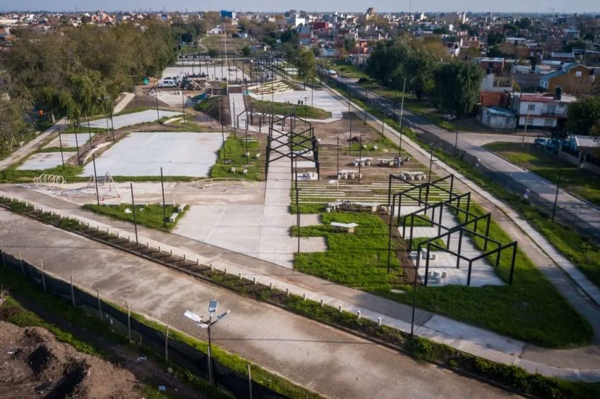 A su vez, se finalizaron las losas de las canchas de fútbol, fútbol tenis, vóley y multideportes, se colocaron las pérgolas, se instaló el tótem de referencia en el sitio, se pusieron los baldosones que forman parte del playón central y la mayoría de los juegos de la estación saludable, calistenia y los diseñados especialmente para el uso de las infancias. En la misma línea, prosigue la colocación de luminarias LED y de siestarios, los cuales son pequeñas intervenciones que acompañan los desniveles del terreno para descansar y que los vecinos y vecinas puedan juntarse allí.