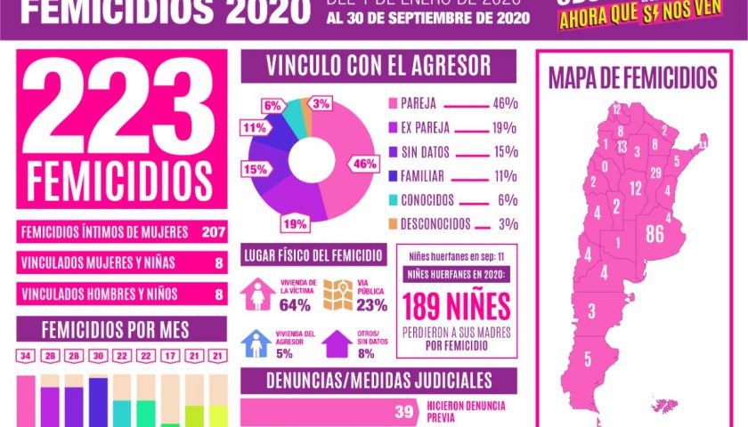 «Desde el Observatorio de las Violencias de Género “Ahora Que Sí Nos Ven” damos a conocer las cifras de femicidios en Argentina entre el 1 de enero y el 30 de septiembre de 2020 elaboradas a partir del análisis de medios gráficos y digitales del país» detalla el Observatorio.