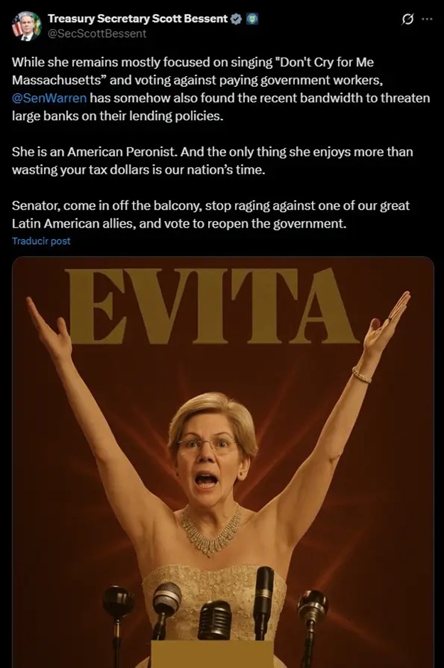 Fue mediante redes sociales, más precisamente X, donde Bessent buscó satirizar a Evita y a Warren mediante una imagen creada con inteligencia artificial (IA). “Si bien ella permanece mayormente enfocada en cantar ‘Don’t Cry for Me Massachusetts’ y votar en contra de pagar a los empleados del gobierno, Warren de alguna manera también ha encontrado el ancho de banda reciente para amenazar a los grandes bancos sobre sus políticas de préstamos”, escribió.