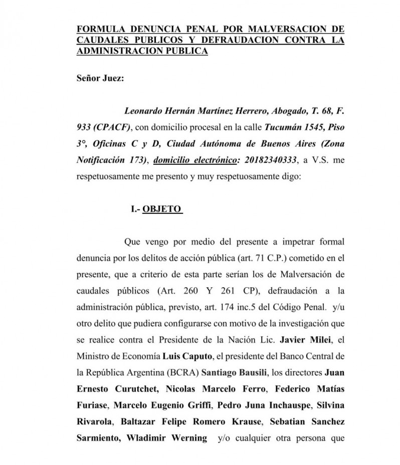 El abogado Leonardo Martínez Herrero presentó una denuncia penal el lunes, previo a que el libertario incriminara a su hermana. La denuncia es por malversación de caudales públicos y defraudación contra la administración pública.