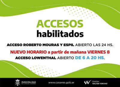 Respecto a los accesos desde el viernes 8 de mayo,  el nuevo horario del Lowenthal será de 6 a 20 horas con los controles correspondientes. Mouras y Espil siguen abiertos las 24 hs.