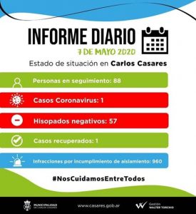 Luego de la aclaración pertinente y antes de avanzar en su alocución, el jefe comunal, detalló los números de la jornada. No hay nuevos casos. Se mantiene el único preexistente, hay uno recuperado, 88 en seguimiento, 57 hisopados y 960 infraccionados.