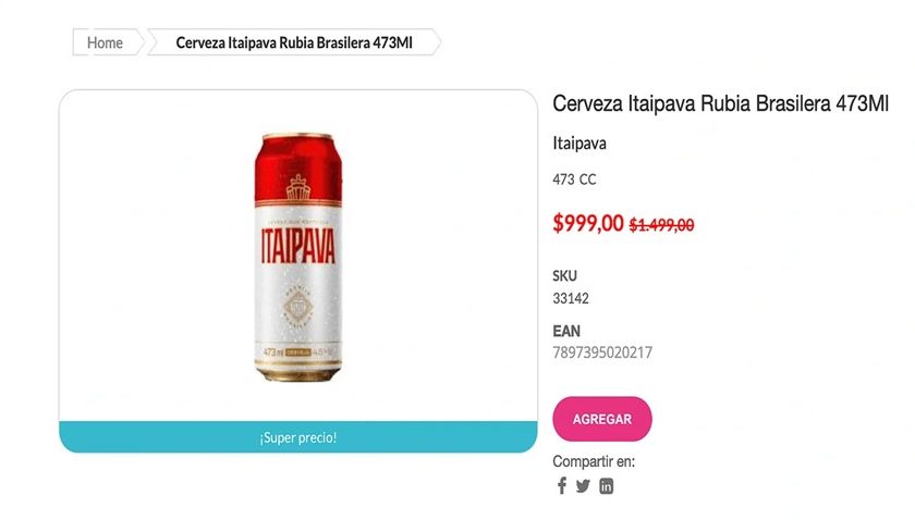 En lo que respecta a la lata de 473 cc, la cerveza rubia Itaipava cuesta $999 en la cadena de supermercados marplatense Toledo, mientras que una lata del mismo tamaño de Imperial cotiza a $2.290 y una de Quilmes está a $2.345.