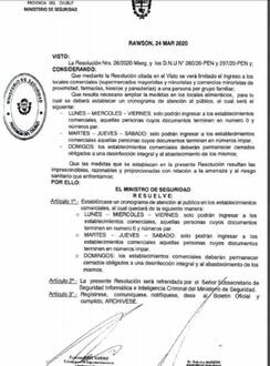 En conferencia de prensa se dio el cuadro de situación en Chubut y se hicieron algunos anuncios, entre ellos el que remarca sobre la salida de las personas a hacer las compras. Se determinó que sólo podrán salir por terminación de DNI y los domingos se cerrarán esos comercios. Por tanto, el cronograma de salidas justificadas por compras se distribuye del siguiente modo: lunes, miércoles y viernes, comprarán aquellos que tengan DNI finalizado en número par y martes, jueves y sábados terminaciones impar.