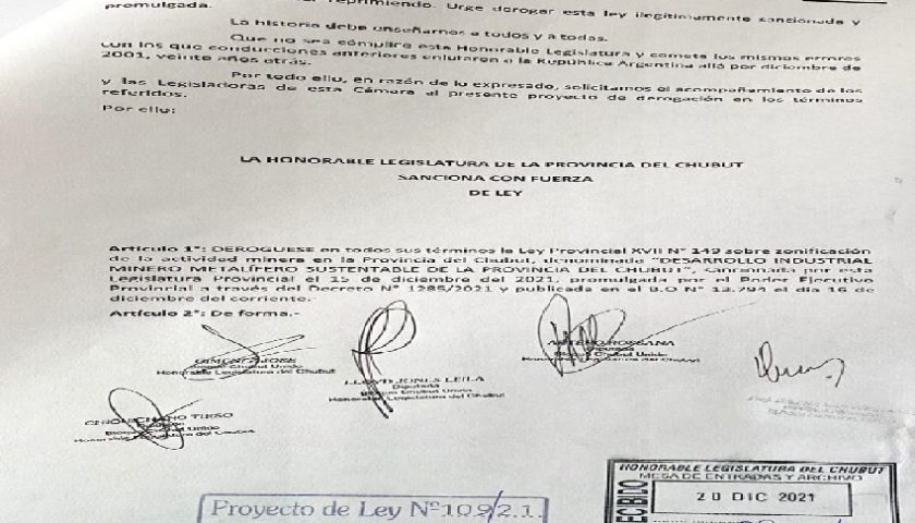 «El presente proyecto de ley pretende la DEROGACIÓN de la Ley XVII N° 149, denominada DESARROLLO INDUSTRIAL MINERO METALÍFERO SUSTENTABLE DE LA PROVINCIA DEL CHUBUT, que fuera escandalosamente aprobada en la sesión del día 15 de diciembre del corriente, por haber sido tratada de espaldas a la sociedad chubutense, e inmediatamente promulgada por el Poder Ejecutivo Provincial y publicada en el B.O. N° 13.794 del día 16 de diciembre» versa el primer párrafo del proyecto en cuestión.
