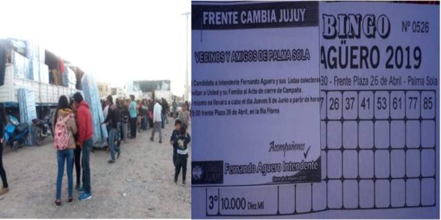 Según consignó el sitio Jujuy Dice, la comunidad de Palma Sola fue invitada a participar en el día de ayer de el “Bingo Agüero 2019”, por el Frente Cambia Jujuy. La invitación, que contaba con un cartón de bingo, expresaba que el candidato a intendente, Fernando Agüero, invitaba a quien recibía la notificación con el bingo, a participar del acto que se llevaría a cabo frente a la Plaza 26 de abril.