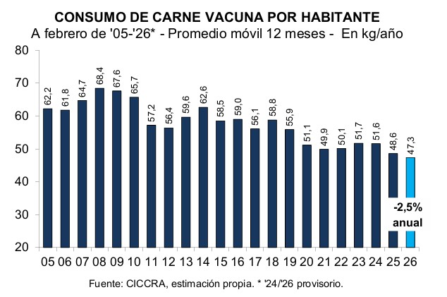 El dato refleja que actualmente el consumo per cápita de carne vacuna en Argentina alcanza los 47,3 kilos por año, lo que implica una caída interanual del 2,5%, al tomar el promedio móvil de los últimos doce meses, de acuerdo con lo manifestado por la Cámara de la Industria y el Comercio de Carnes y Derivados de la República Argentina (CICCRA).