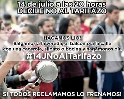 Este jueves 14 de julio a las 20hs, los usuarios se haran oír contra el tarifazo. La consigna es abierta: desde tu casa, desde el balcón, desde las calles y parques de todo el país, con un silbato, una cacerola o tocando la bocina, los argentinos repudiaran esta política de ajuste.