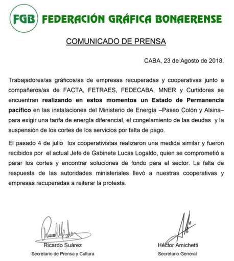 Las cooperativas, nucleadas en la Federación Gráfica Bonaerense, Sindicato de Obreros Curtidores, FEDECABA, FETRAES, FACTA y MNER, se habían llevado un compromiso del actual jefe de Gabinete Lucas Logaldo. El funcionario había asegurado que el Estado iba a “parar los cortes de energía y, en las próximas semanas, ofrecer soluciones”. Sin embargo, “todo quedó en la nada y faltando a sus palabras nunca más nos llamaron ni nos atendieron nuestros llamados”, explicaron los sindicatos y las federaciones a través de un escrito.