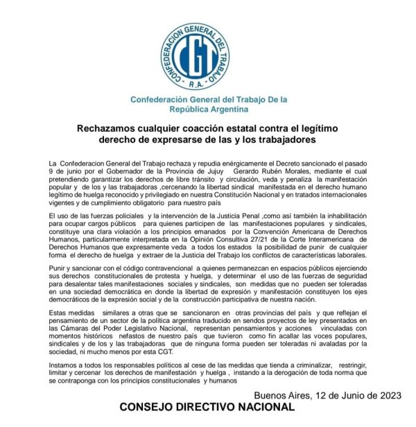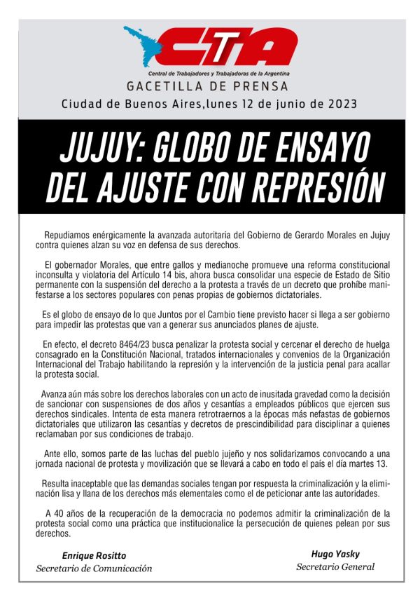 Por su parte, la CTA Autónoma, que conduce Hugo “Cachorro” Godoy, denunció a Gerardo Morales ante la Organización Internacional del Trabajo (OIT) por su intento de “restringir el derecho constitucional de protesta y huelga”.