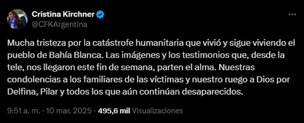 La expresidenta Cristina Fernández de Kirchner se refirió públicamente a la catástrofe humanitaria que vivió y sigue viviendo el pueblo de Bahía Blanca.
