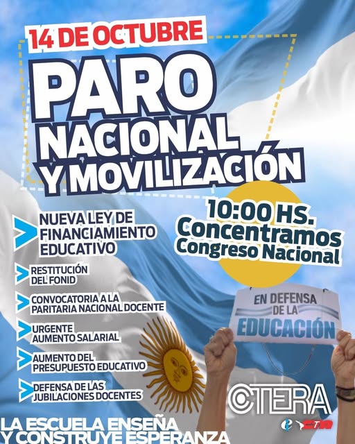 Bajo el lema “La Escuela enseña y construye esperanza”, en esta jornada nos movilizaremos al Congreso de la Nación, a partir de las 10 hs, para luego marchar y llegar al Palacio Pizzurno a las 12 hs. Lxs Docentes exigimos: