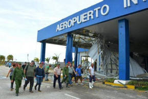 Ramón Espinosa Martín, miembro del Buró Político del Partido Comunista de Cuba y Viceministro de la Fuerzas Armadas Revolucionarias (FAR), y Manuel Marrero, ministro de Turismo (Mintur) recorren junto a Enrique Andión coordinador general del Aeropuerto Internacional Jardines del Rey para conocer sobre los daños ocasionados en el mismo. 10 de septiembre de 2017. Ciego de Ávila, Cuba. Foto: Osvaldo Gutiérrez/ ACN.