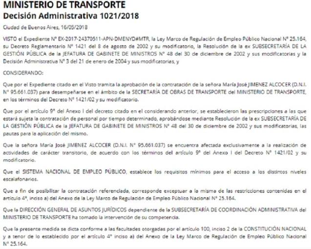 Se trata de María José Jiménez Alcocer, una profesora de teatro de 33 años que realizó sus estudios en España. Su incorporación a la Secretaría de Obras de Transporte, dependencia que se encuentra bajo la órbita de la cartera de Dietrich, fue oficializada esta mañana en la Resolución 1021/2018, bajo la firma del jefe de Gabinete, Marcos Peña.