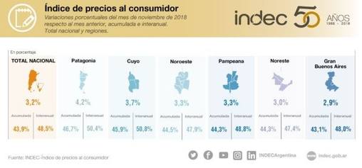 El Instituto Nacional de Estadísticas y Censos (Indec) informó que en lo que va de 2018 los precios en el país han aumentado un 43,9 por ciento, la cifra es la más alta de la salida de la convertibilidad en 1991. De acuerdo con el reporte, el costo de la vida para los trabajadores asalariados sindicalizados aumentó 2,9 por ciento mensual en noviembre y el total del año fue de 47,2 por ciento.