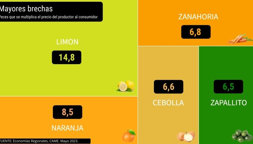 El limón (14,8 veces), la naranja (8,5), la zanahoria (6,8), la cebolla (6,6) y el zapallito (6,5) fueron los cinco productos que presentaron mayor diferencia entre los precios de origen y destino.