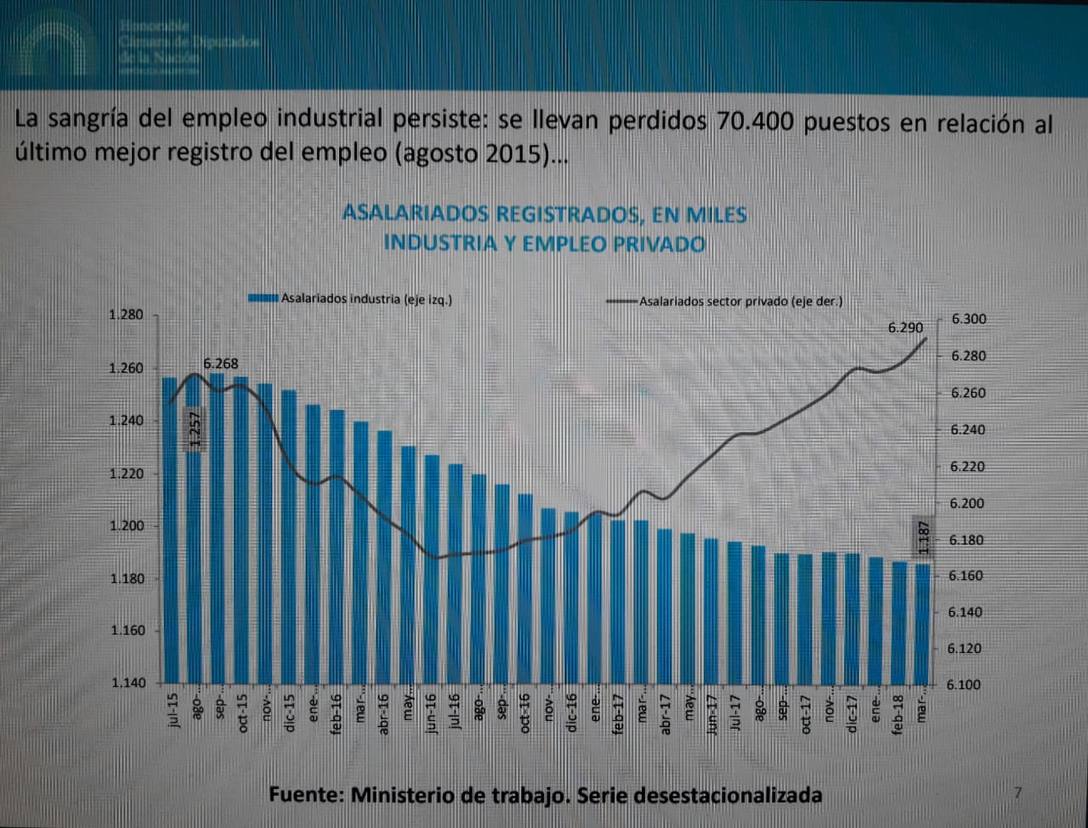 La presidencia de la Comisión de Industria de la Cámara de Diputados de la Nación, que preside el diputado José Ignacio de Mendiguren (Frente Renovador), publicó el «Informe de Actualidad Industrial» correspondiente al mes de junio de este año. Entre otros datos, el estudio da cuenta de que al industria registró una caída del 1,4% en marzo en relación a marzo, en el último trimestre se perdieron 15 mil puestos de trabajo en la industria manufacturera, sector que desde fines del 2015 a junio de este año registró una disminución de 70.400 puestos de trabajo.