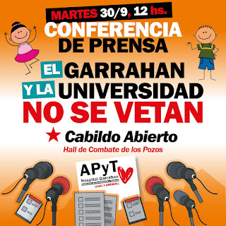 La Asociación de Profesionales y Técnicos (APyT) del Hospital Garrahan realizará hoy, martes 30 de septiembre, a las 12 horas, una conferencia de prensa en el hall de la calle Combate de los Pozos 1881, bajo la consigna «El Garrahan y la Universidad no se vetan».