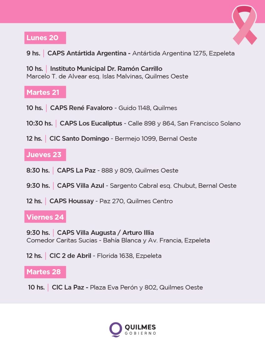 El Municipio de Quilmes informa que desde el lunes 20 al martes 28 de octubre y en el marco del Mes de Concientización sobre el Cáncer de Mama, más conocido como Octubre Rosa, se van a estar llevando a cabo diversas charlas, talleres y consejerías en diferentes Centros de Atención Primaria de Salud (CAPS) y Centros de Integración Comunitaria (CIC) del distrito.