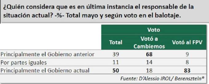 “¿Quién considera que es en última instancia el responsable de la situación actual?”, fue una de las consultas del relevamiento. El 50% marcó que se debe a las decisiones políticas y económicas del gobierno comandado por Mauricio Macri. En tanto, el 39% respondió que la responsabilidad corre por el Gobierno anterior.