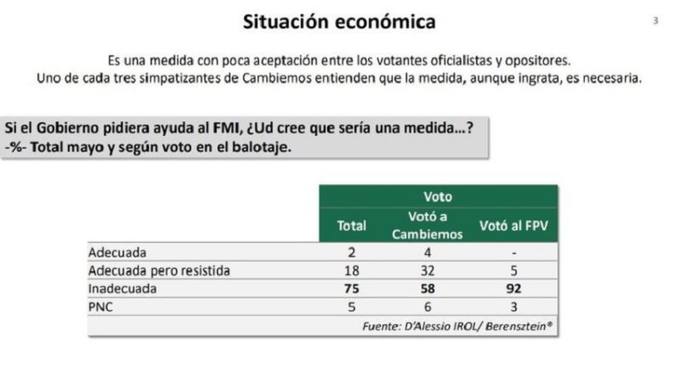 El relevamiento lanzó que el 75% de los encuestados calificó de “inadecuada” la por entonces opción de que el Gobierno pidiese ayuda al FMI, mientras que el 18% sostuvo que es adecuada, pero resistida.