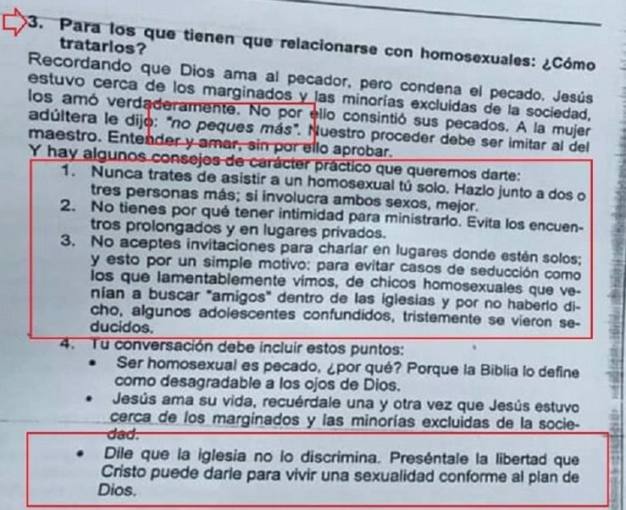 “Nunca trates de asistir a un homosexual tu sólo. Hazlo junto a dos o a tres personas más; si involucra ambos sexos mejor. Evita los encuentros prolongados y en lugares privados”, puede leerse en el libro titulado “Cuidado, llegaron los adolescentes”, y escrito por José Luis Cinalli. Se trata de un pastor de la Iglesia de la Ciudad de Resistencia.