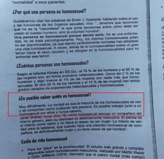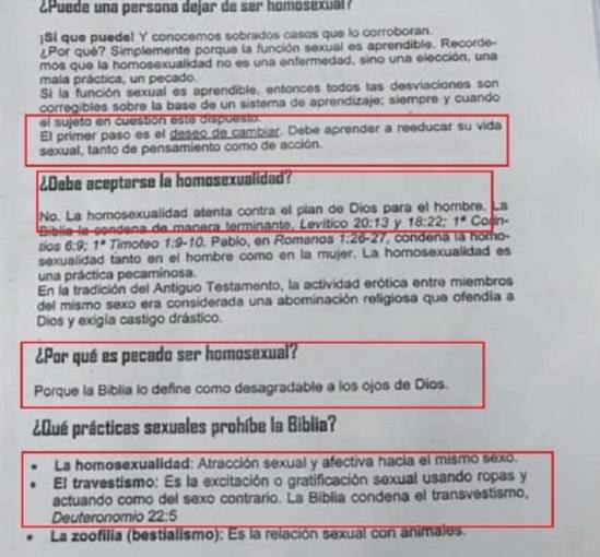 Entre las frases más temerarias, destacan: “La homosexualidad es una práctica pecaminosa que atenta contra el plan de dios”; y “es una abominación religiosa”.