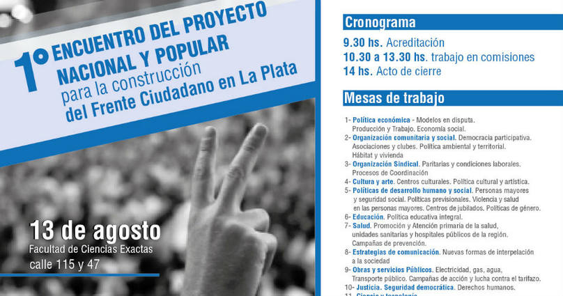 Más de 75 organizaciones políticas, sociales, culturales, estudiantiles, sindicales, de derechos humanos y asambleas vecinales convocan al 1º Encuentro del Proyecto Nacional y Popular para la construcción del Frente Ciudadano en La Plata.