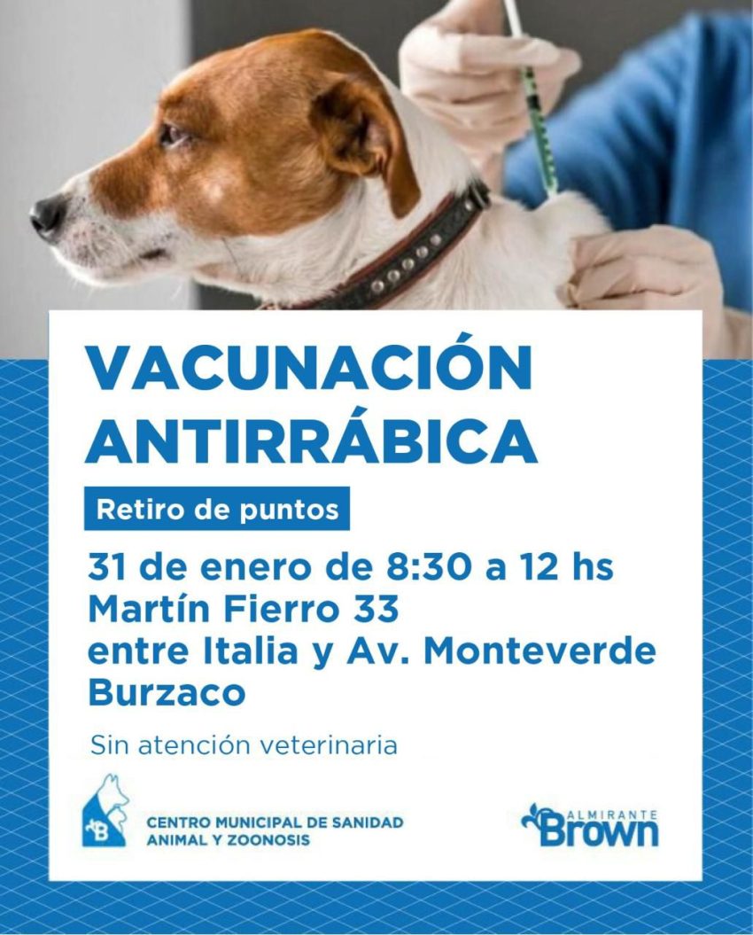 El Municipio de Almirante Brown, a través del área de Zoonosis, llevará adelante una nueva jornada gratuita de vacunación antirrábica destinada a perros y gatos en la localidad de Burzaco.