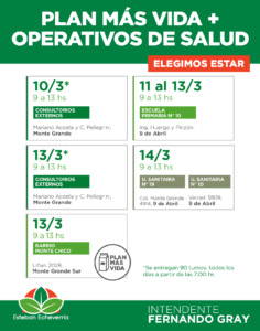 Además, el viernes 13 de marzo se realizarán inscripciones al Plan Más Vida con entrega de leche, en Liñán 2028, Monte Grande Sur, donde los interesados en inscribirse deberán concurrir con negativa de ANSES de los padres, que se puede solicitar a través de la siguiente página: www.anses.gob.ar/consulta/certificacion-negativa, libreta de vacunación de los menores y acta de nacimiento.