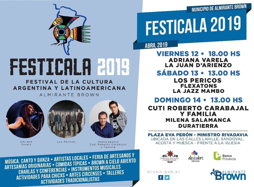 El Municipio de Almirante Brown, a través del Instituto municipal de las Culturas, llevará a cabo del viernes 12 al domingo 14 de abril una nueva edición del Festival de la Cultura Argentina y Latinoamericana (Festicala), en el marco del programa de Recuperación de Fiestas Populares impulsado por la gestión del intendente Mariano Cascallares.
