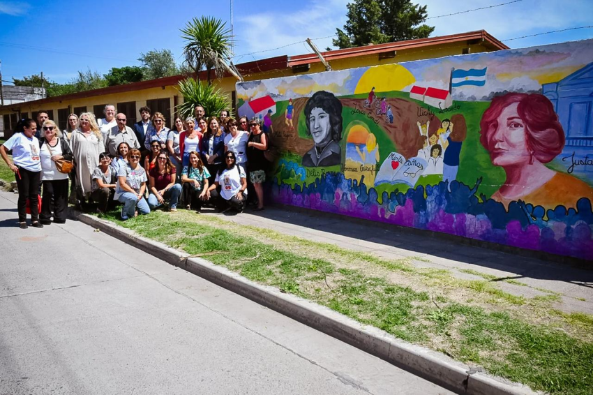 La Ministra también visitó la Escuela Secundaria N°8 donde se encuentra el mural realizado en el marco del programa “Ellas no estaban pintadas”, que retrata a referentas de la comunidad azuleña entre las que se destacan la docente y periodista Justa Gallardo y Delia Bermay, integrante de las manzaneras.