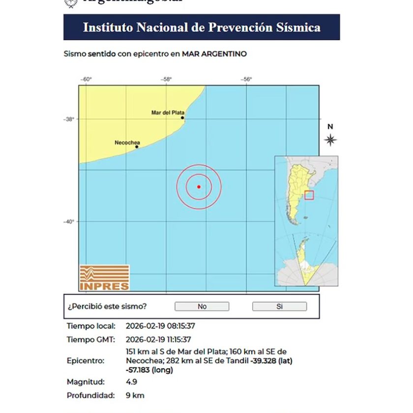 Al respecto, el Servicio Geológico Minero Argentino (SEGEMAR) comunicó en la actualización de su informe que este jueves 19 de febrero a las 08.15 horas se reportó un sismo de 4.9 puntos y que tuvo una profundidad de 9 kilómetros.