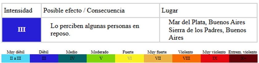 Acerca de las consecuencias, describieron que “se percibe en el interior de los edificios. Puede no reconocerse como un sismo. Los objetos colgados oscilan levemente. Vibraciones como las que producen los camiones ligeros al pasar”.