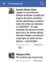 Como si fuera poco, añadió que «hay muchos que piensan como yo pero no se animan decirlo». El posteo generó una ola de repudios entre sus propios contactos, quienes acusaron a la funcionaria de racista. Y fue màs allà aún, expresando textualmente: «…hablo de negros de alma vendidos lacras apestosas que quieren todo de arriba.»