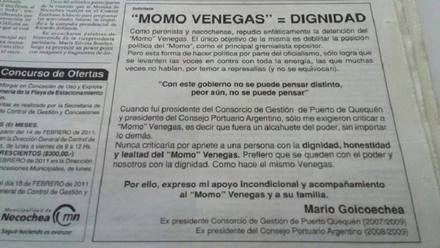 Fue Goicochea el autor de una solicitada que firmando a quien fuera ex presidente del Consorcio de Gestión de Puerto Quequén (2007-2009) y ex presidente del Consejo Portuario Argentino (2008-2009), declamaba «MOMO VENEGAS» = DIGNIDAD.