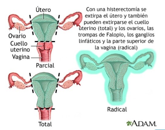 Histerectomía vaginal; Histerectomía abdominal; Histerectomía supracervical; Histerectomía radical; Extirpación del útero; Histerectomía laparoscópica; Histerectomía vaginal asistida por laparoscopia; LAVH; Histerectomía laparoscópica total; TLH; Histerectomía suprocervical laparoscópica; Histerectomía asistida por robot