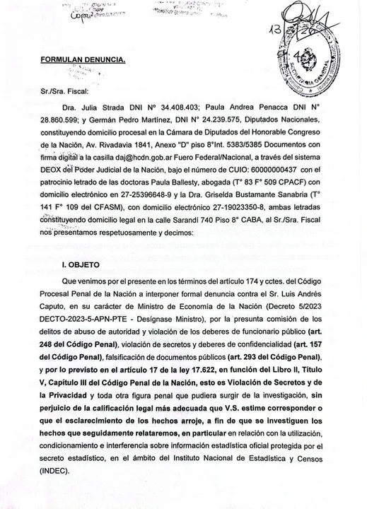 Los diputados nacionales de Unión por la Patria Julia Strada, Germán Martínez y Paula Penacca presentaron este viernes una denuncia penal contra el ministro de Economía, Luis Caputo, por las recientes irregularidades que distorsionaron el funcionamiento del Instituto Nacional de Estadística y Censos (INDEC) al momento de dar a conocer la inflación del mes de enero.