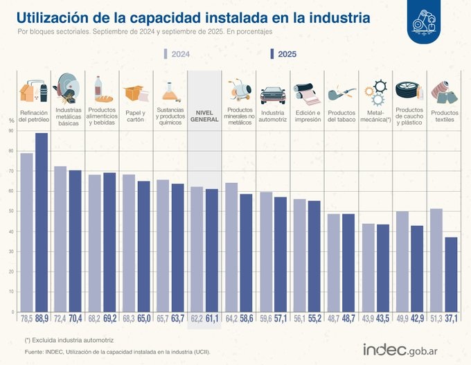 Los números reflejan una realidad inocultable. La utilización de la capacidad instalada en la industria local fue del 61,1% en el noveno mes del año 2025, lo que representó una caída en comparación con el mismo período del 2024, que se situó en 62,2%.
