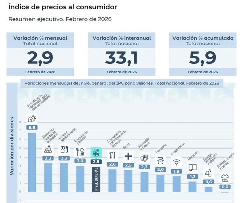 LA INFLACIÓN NO PARA: 2,9% en FEBRERO y 5,9% en 2026