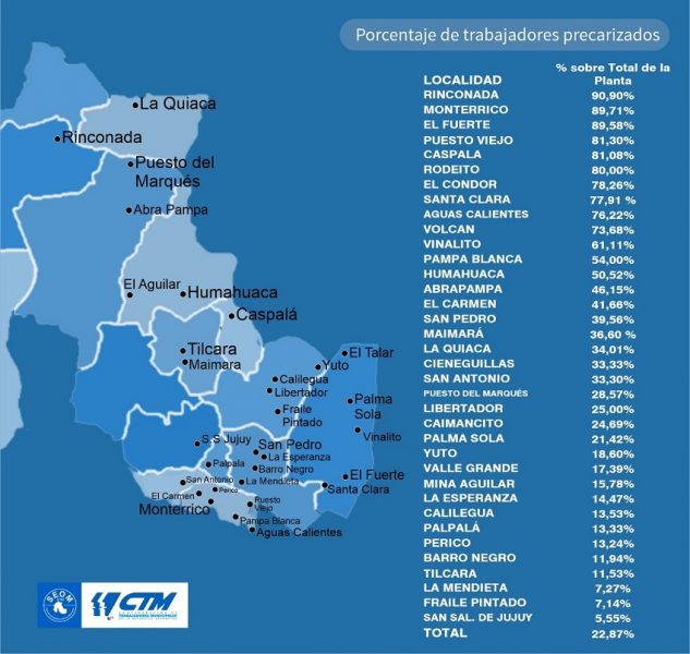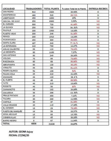 La inusual situación puso en riesgo la salud de toda la provincia cuyos habitantes cumplen, la tercera etapa de cuarentena obligatoria. En las localidades donde obligan a trabajar a más de un 80% de la planta de personal son: Monterrico, Santa Clara, Puesto Viejo, El Fuerte, Aguas Calientes, El Cóndor, Rodeíto, Volcán, Caspalá, entre otras.