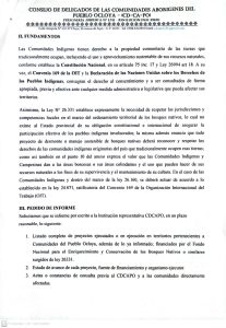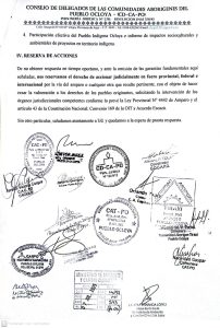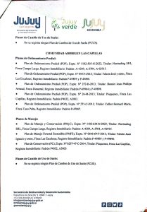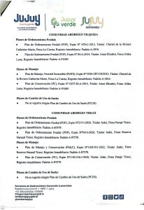 Se deja constancia que los proyectos de Ley 26331 de protección de bosques nativos que se ejecutan en territorio comunitario, no cuentan con la consulta previa ni el consentimiento del Pueblo Indígena Okloya; los mismos constan en informe presentado por la Secretaria de Biodiversidad y Desarrollo Sustentable al CDCAPO; el Pueblo Okloya desconoce a los beneficiarios de mencionados proyectos que afectan a las Comunidades Tilquiza, Las Capillas, Normenta Pacha y Tiraxi; los mismos no tienen ninguna facultad, ni potestad sobre las Comunidades Aborígenes del Pueblo Okloya.