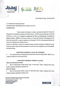Las Comunidades Indígenas del Pueblo Okloya reclamó la suspensión de proyectos que no cuentan con la apropiada consulta previa, libre e informada en el marco del Ordenamiento Territorial de Bosques Nativos así lo solicitan a la Ministra de Ambiente y Cambio Climático de la provincia de Jujuy, María Inés Zigaran.